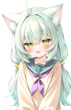 masterpiece,absurdres,best quality,petite,high quality,chromatic_aberration,//,1girl,:d,ahoge,animal_ear_fluff,animal_ears,blush,cat_ears,cat_girl,collarbone,dot_nose,double-parted_bangs,fang,green_eyes,green_hair,green_sailor_collar,green_shirt,hair_between_eyes,hair_bobbles,hair_intakes,hair_ornament,long_hair,long_sleeves,looking_at_viewer,neckerchief,open_mouth,purple_neckerchief,sailor_collar,shirt,sidelocks,simple_background,skin_fang,sleeves_past_wrists,smile,solo,thick_eyebrows,twintails,upper_body,white_background,commentary_request,highres<lora:鬼针草2——【CKXL】hans:0.9>,