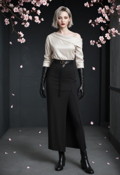 (standing full_body:1.1),(looking at viewer:1.1),masterpiece,(best quality),smog,Dark room,dim lighting,peach blossom,falling petals,<lora:YQ_Illustrious光辉v5_格蕾丝_V1:0.8>,q1528437228,solo,1girl,short hair,shirt,earrings,jewelry,blonde hair,gloves,black gloves,white shirt,grey eyes,hoop earrings,skirt,grey hair,red lips,black skirt,belt,long sleeves,long skirt,brown eyes,pants,black footwear,black hair,boots,elbow gloves,lipstick,blue eyes,multicolored hair,off-shoulder shirt,