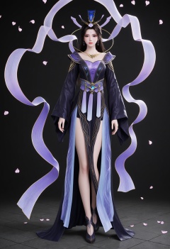 (standing full_body:1.1),(looking at viewer:1.1),masterpiece,(best quality),smog,Dark room,dim lighting,peach blossom,falling petals,<lora:YQ_Illustrious光辉v5_紫霞_V1:0.8>,q1528437228,1girl,solo,black hair,long hair,jewelry,hair ornament,dress,earrings,necklace,Celestial streamers,Flowing streamer,Silk streamer,Trailing ribbon,ribbons,long sleeves,forehead mark,sash,chinese clothes,wide sleeves,purple dress,brown hair,shawl,hat,black footwear,black dress,purple eyes,floating,obi,hagoromo,bare legs,brown eyes,hair bun,side slit,