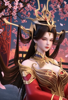 (upper_body:1.2),(looking at viewer:1.1),masterpiece,(best quality),smog,Dark room,dim lighting,peach blossom,falling petals,<lora:YQ_Illustrious光辉v5_朱雀若天_V1:0.8>,q1528437228,1girl,solo,long hair,hair ornament,jewelry,earrings,brown hair,black hair,dress,red dress,detached sleeves,detached collar,red eyes,long sleeves,brown eyes,collar,metal collar,wide sleeves,blue eyes,high heels,hair rings,chinese clothes,headgear,forehead mark,