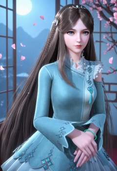(upper_body:1.2),(looking at viewer:1.1),masterpiece,(best quality),smog,Dark room,dim lighting,peach blossom,falling petals,<lora:YQ_Illustrious光辉v5_宁荣荣_V1:0.8>,q1528437228,1girl,solo,long hair,brown hair,hair ornament,dress,blue eyes,blue dress,braid,tiara,detached sleeves,long sleeves,black hair,jewelry,bracelet,butterfly hair ornament,very long hair,green dress,skirt,brown eyes,shoes,necklace,blonde hair,hairband,asymmetrical sleeves,gem,chinese clothes,pantyhose,gloves,grey hair,thighhighs,shorts,sleeveless,socks,