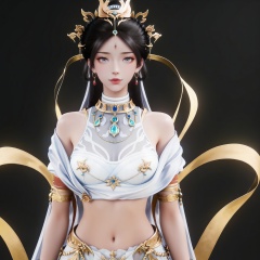 black hair,long hair,grey eyes,hair_bun,hair_ornament,earrings,necklace,sash,forehead_jewel,crop_top,midriff,navel,see-through cleavage,1girl,solo,bracelet,white skirt,