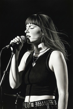 midjourneyanalog15t photograph. Black-and- white, low-angle shot of a young woman shown in side-profile, singing with intensity in a dark concert setting. She has long, dark hair with straight bangs, caught in motion blur as it flows behind her. Her eyes are closed, and she holds a microphone close to her mouth. She is dressed in a black **** crop top, layered silver chain necklaces with a heart pendant, and a metallic chain belt.