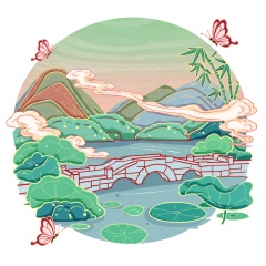 XSDB,圆形构图环抱杭州西湖,景致坐落于写意的层叠烟峦与荷塘纹样之中,以干净利落的线条勾勒,采用翠绿、柔粉、雾蓝配色。粗黑轮廓线刻画石桥与荷叶形态,平涂色块搭配柔和渐变塑造空间层次,无浓重明暗阴影。云雾与竹丛处运用质感笔触,为平滑画面增添细腻变化。两只粉蝶翩飞平衡画面四角,尽显和谐气韵。整体氛围温婉诗意,以现代简化的插画语言与韵律化视觉节奏,演绎中式古典山水意境。