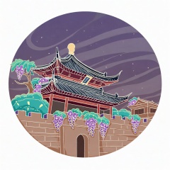 XSDB,中式圆形画幅承载南京夫子庙,古城墙与紫藤缠绕古建,深紫、胡桃色温润画面,工整线条刻画庙檐轮廓,平涂技法塑造层次,尽显金陵古城的儒雅底蕴