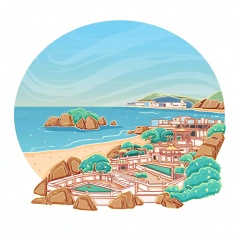 XSDB,新式国画圆形构图呈现厦门鼓浪屿,海岸礁石与南洋庭园错落,海蓝、沙米色铺陈,灵动线条刻画海岛轮廓,轻渐变塑造水汽质感,尽显海滨小城的清新闲适