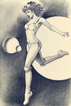Monochrome pencil drawing of a woman shown in 3/4 view, with curly dark hair tied up, adorned with small dark ornaments. She is depicted in a dynamic leaping pose. She wears a light-colored, bra-like top with wide straps and high-waisted ruffled briefs, along with knee-high light-colored soft boots. Her mouth is open, and she looks downward with a focused expression. Her arms are spread. The background is dark and textured, featuring two large, smooth, planetary objects to her left, and another larger light circle behind her on the right.