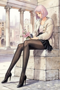 Full-body shot of a young woman shown in 3/4 view, with a soft expression and short, pastel pink bobbed hair. She is perched on a thick, beige stone ledge within a grand, classical colonnade. Her outfit features a chunky, cream-colored knit cardigan over a light-colored top, paired with a short, black pleated skirt, opaque black tights, and black high-heeled pumps. She holds a small, delicate bouquet of pink flowers and a smartphone in her lap. The background is a softly blurred urban square with historic architecture under a hazy sky.