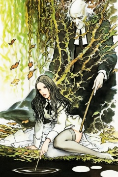 A woman with long, dark, flowing hair sits on the ground in the foreground, looking at the viewer. She wears a white dress with a black bow at the neck and grey thigh-high stockings, extending her right arm to dip a thin stick into a dark puddle, creating ripples. Behind her, an older, bald man in a dark suit with a white clerical collar looks down, largely obscured by dense, intertwining green and yellow foliage. He holds a stick in his right hand, reaching towards the woman. The scene is filled with twisted vines and scattered brown leaves on the dark ground, with bright light illuminating the setting from the left.