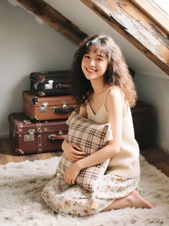 FSJP, 富士胶片色文艺人像,卷发少女跪坐于铺满羊毛地毯的阁楼角落,怀中抱着复古格纹抱枕,身着米杏色针织吊带与碎花半裙,顶部柔光漫射而下,照亮脸颊的柔和轮廓与发丝的蓬松质感,背景是斑驳的原木斜顶与堆叠的旧行李箱,浅灰调朦胧背景衬出暖调主体,少女嘴角噙着浅笑,指尖轻触抱枕流苏,地毯的绒感与木质纹理让画面充满温润的复古质感。