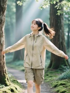 FSJP, 富士胶片色户外森系摄影,高马尾少女漫步在林间小径,双臂自然张开感受微风,身着浅卡其色户外速干衣与工装短裤,林间穿透的丁达尔光落在肩头与树叶上,背景是模糊的参天古树与苔藓地面,胶片的青绿色调浓郁自然,发丝随风飘动,树皮的粗糙纹理与衣料的挺括感形成对比,画面充满自由气息。