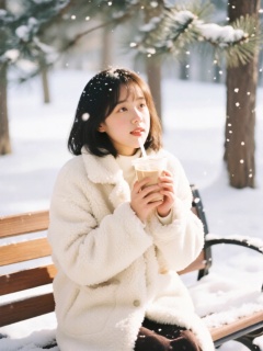 FSJP, 富士胶片色冬日暖系摄影,少女裹着米白色羊羔毛外套坐在林间积雪的实木长椅上,双手捧着热奶茶,空中飘着细碎雪花,冬日午后暖阳与户外冷冽空气形成温柔对比,背景是模糊的落雪松枝与白茫茫雪地,富士柔和暖调胶片质感,羊羔毛的蓬松肌理与奶茶杯的温热光泽尽显冬日治愈氛围