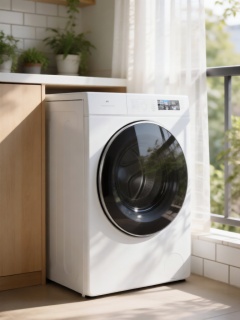 SNJJ, 白色滚筒洗烘一体机放置在阳台定制洗衣柜旁,机身线条利落,舱门玻璃通透清亮,午后阳光透过阳台纱帘漫射,照亮机身哑光白釉质感与洗衣柜的浅木纹,背景是模糊的绿植盆栽与白色阳台墙砖,实用温馨的居家洗护场景兼具美感与功能性。