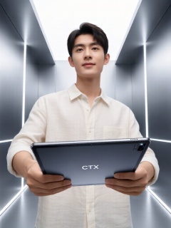 CPTX, 气质沉稳的青年身着米白色亚麻衬衫,双手轻展一台超薄全面屏平板电脑,机身采用深空灰航空铝材质,边框极窄无冗余设计,屏幕亮着极简科技界面。他身处未来感金属质感实验室,墙面为哑光合金材质,线性冷白光从墙面凹槽透出,纵深的空间线条强化视觉纵深感,柔和顶光让平板机身折射出细腻光泽,整体格调简约高级且充满科技严谨感。