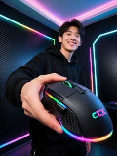 CPTX, 潮流感十足的年轻男性身着黑色电竞风连帽衫,掌心稳稳托举着一款RGB 电竞机械鼠标,鼠标为哑光亲肤材质,侧边配有纹理防滑区,底部透光灯带暗藏流光特效。他置身暗黑科技电竞房,背景是碳纤维质感墙面与幻彩灯带,顶光与环境光交织,鼠标在光影下尽显棱角质感,少年嘴角带浅笑,打造出酷炫热血的电竞科技氛围感。