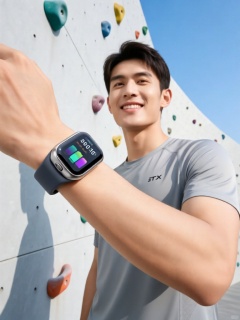 CPTX, 运动健朗的年轻男性身着速干运动短袖,抬手展示腕间多功能运动手环,手环为液态硅胶表带搭配高清彩屏,表身是轻量化合金材质,屏幕显示着运动数据。他站在户外极简攀岩墙旁,自然侧光勾勒出手环的轻薄质感,背景是浅灰攀岩墙面与蓝天,神情阳光自信,尽显户外科技运动美学。