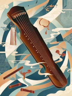 XDGF, 古琴横陈于对称书香云纹的分层装饰构架中,桐棕、石青与象牙白分层铺陈出温润雅致的色调,干净线条勾勒琴身纹路与琴弦形态,淡墨渐变与细刻纹理赋予琴体与书卷质感,主色调为檀棕、藏青与玉白,琴轸与书扣缀以朱砂点缀,冰纹肌理、背景博古纹与墨痕晕染错落有致,凭借对称美学与新中式笔触,传递清雅文气又静谧内敛的格调。