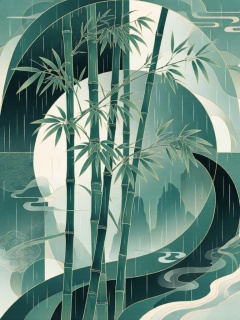 XDGF, 青竹成林立于对称烟雨纹的同心圆装饰框架中,翠绿、墨青与霜白分层晕染出清隽雅致的色调,利落线条勾勒竹节挺拔与竹叶舒展,淡彩渐变与细笔点绘赋予竹身与雨雾层次,主色调为竹青、玄黑与牙白,竹梢与雨丝缀以银灰点缀,竹纹肌理、背景云纹与水波纹错落精致,凭借对称构图与现代国风装饰语言,营造清逸挺拔又静谧淡然的氛围。