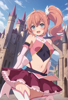 masterpiece, best quality, very aesthetic, absurdres, sensitive, scenery, 1girl, solo, looking at viewer, dynamic angle, cowboy shot, long shot, symmetrical,shiny skin, angel rose, pink brown hair, long hair, side ponytail with white wings hair ornament, bangs, hair between eyes, blue eyes, medium breasts, black inner shirts, pink bolero, high neck, light pink collar, crop top, midriff, navel, sleeveless, dark pink skirt, layered skirt, pink short pelvic curtain, dark pink skirt with light pink back ribbon, light pink armwear, white thigh boots, smile, blush, open mouth, random poses, standing, castle, blue sky, sunny, <lora:エンジェルローズ:1>