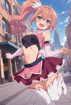 masterpiece, best quality, very aesthetic, absurdres, sensitive, scenery, 1girl, solo, looking at viewer, dynamic angle, cowboy shot, long shot, symmetrical,shiny skin, angel rose, pink brown hair, long hair, side ponytail with white wings hair ornament, bangs, hair between eyes, blue eyes, medium breasts, black inner shirts, pink bolero, high neck, light pink collar, crop top, midriff, navel, sleeveless, dark pink skirt, layered skirt, pink short pelvic curtain, dark pink skirt with light pink back ribbon, light pink armwear, white thigh boots, smile, blush, open mouth, random poses, dynamic pose, city, sidewalk, blue sky, sunny, <lora:エンジェルローズ:1>