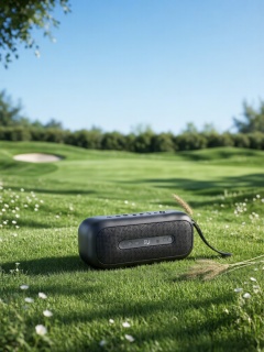 CDCJ, 一台便携蓝牙音箱放置在开阔的高尔夫草坪上,草地平整翠绿,零星点缀白色小花,正午明亮光线笼罩,音箱磨砂外壳质感高级,旁侧斜放一根干草,背景是澄澈蓝天与远处树篱,整体简约大气,凸显户外影音的休闲氛围。