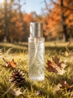 CDCJ, 一瓶清透的植物精华爽肤水立在秋日泛黄的草地上,草叶间夹杂着干枯枫叶与浅棕松果,暖调午后斜阳漫洒,瓶身折射出柔和光泽,瓶身标签印有草本纹样,一侧舒展着几片枫树叶,背景是暖橙调的林间远景,氛围温润复古,自然质感浓郁。