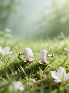 CDCJ, 一对简约陶瓷耳钉摆放在嫩草与白色花瓣交织的草地上,柔光细腻勾勒金属光泽,陶瓷质感温润,草叶轻托耳钉,背景是朦胧的浅绿植被,画面精致小巧,凸显饰品的清新轻奢质感。