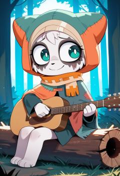 Jalalá, 1girl, solo, no humans, anthro, panda, pupils have a bluish tint, dark marks around the eyes that look like smudged mascara, rough white fur, small scratches on the cheeks, ((patchwork coat in orange, blue, and green)), hooded coat with a yellow bottom, orange and yellow scarf with a square wave pattern, smile, He plays a guitar, he is sitting on a log, forest, afternoon, dim lighting, soft lighting, perfect shading, masterpiece,