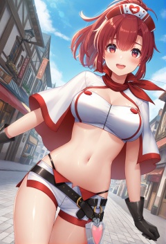 masterpiece, best quality, very aesthetic, absurdres, sensitive, scenery, 1girl, solo, looking at viewer, dynamic angle, cowboy shot, long shot, symmetrical,shiny skin,natsume akari, red hair, haigh ponytail, bangs, hair between eyes, red eyes, large breasts, red-trimmed outfit, white tube top, crop top, midriff, navel, strapless, sleeveless, white capelet, white short shorts, heart print nurse cap, red scarf bandana, black belt, black gloves, smile, blush, open mouth, random poses, town, sidewalk, blue sky, sunny, <lora:棗あかり:0.8>