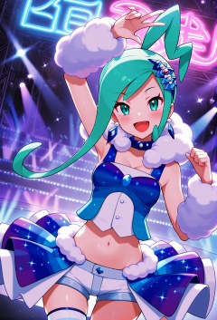 masterpiece, best quality, very aesthetic, absurdres, sensitive, scenery, 1girl, solo, looking at viewer, dynamic angle, cowboy shot, long shot, symmetrical,shiny skin, lisia, dark skin, aqua hair one side up, asymmetrical sidelocks, swept bangs, aqua eyes, medium breasts, blue glitter hair ornamenr, blue glitter earrings, white camisole with blue glitter chest ribbon, crop top, midriff, navel, white short shorts, blue glitter open front skirt, layered open front skirt, open front skirt with fluffy trim, blue glitter choker, fluffy neckwear, fluffy armwear, light blue striped single thighhigh, smile, blush, open mouth, random poses, stage, stage lights, neon lights, <lora:ルチア:0.9>