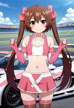 masterpiece, best quality, very aesthetic, absurdres, sensitive, scenery, 1girl, solo, looking at viewer, cowboy shot, long shot, symmetrical,shiny skin, tsukisato kirari(race queen cos), brown hair, very long hair, twintails with pink ribbon, brown eyes, bangs, hair between eyes, small breasts, pink shirts wth white center,collared shirts, sleeveless, white-trimmed neckline, white cross neck ornament, crop top,midriff, navel,pink skirt with white cross pattern, pink miniskirt with white trim, pink upper-arm band, vertically split color elbow gloves, half pink half white gloves, two-tone split down the middle elbow gloves, fingerless gloves, brown thighhighs with pink trim, smile, blush, w arms, racing circuit, racing car, blue sky, sunny, <lora:月里光:0.9>