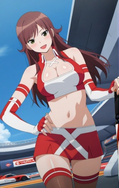 masterpiece, best quality, very aesthetic, absurdres, sensitive, scenery, cowboy shot, long shot, (1girl, solo:1.2), looking at viewer, dynamic angle, symmetrical,shiny skin, smile, open mouth, blush, hand on own hip, racing circuit, blue sky,akana rui(race queen cos),reddish brown hair,long hair,straight hair,black eyes,bangs,red lipstick,large breasts,gyrozetter race queen(costume),red shirts wth white center,colored shirts,sleeveless,white-trimmed neckline,white cross neck ornament,crop top,midriff,navel,red skirt with white cross pattern,red miniskirt with white trim,red upper-arm band,vertically split color elbow gloves,half red half white outfit,two-tone split down the middle elbow gloves,fingerless gloves,brown thighhighs with red trim