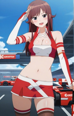 masterpiece, best quality, very aesthetic, absurdres, sensitive, scenery, cowboy shot, long shot, (1girl, solo:1.2), looking at viewer, dynamic angle, symmetrical,shiny skin, smile, open mouth, blush, salute, standing, racing circuit, blue sky,akana rui(race queen cos),reddish brown hair,long hair,straight hair,black eyes,bangs,red lipstick,large breasts,gyrozetter race queen(costume),red shirts wth white center,colored shirts,sleeveless,white-trimmed neckline,white cross neck ornament,crop top,midriff,navel,red skirt with white cross pattern,red miniskirt with white trim,red upper-arm band,vertically split color elbow gloves,half red half white outfit,two-tone split down the middle elbow gloves,fingerless gloves,brown thighhighs with red trim