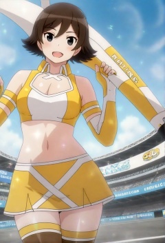 masterpiece, best quality, very aesthetic, absurdres, sensitive, scenery, cowboy shot, long shot, (1girl, solo:1.2), looking at viewer, dynamic angle, symmetrical,shiny skin, smile, open mouth, blush, random poses, racing circuit, blue sky,nanatsu sei(race queen cos),dark brown hair,short hair,flipped hair,bangs,hair between eye,black eyes,large breasts,yellow shirts wth white center,collared shirts,sleeveless,white-trimmed neckline,white cross neck ornament,crop top,midriff,navel, yellow skirt with white cross pattern,yellow miniskirt with white trim,yellow upper-arm band,vertically split color elbow gloves,half yellow half white gloves,two-tone split down the middle elbow gloves,fingerless gloves,brown thighhighs with yellow trim