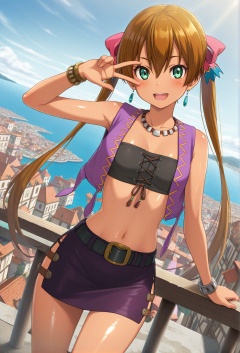 masterpiece, best quality, very aesthetic, absurdres, sensitive, scenery, 1girl, solo, looking at viewer, dynamic angle, cowboy shot, long shot, symmetrical,shiny skin, melty(garugantia), brown hair, very long hair, twintails with pink ribbon, bangs, hair between eyes, green eyes, small breasts, black thbe top, front-lace up top, crop top, midriff, navel, purple open jacket, midriff jacket, sleeveless, dark purple skirt, slit skirt, miniskirt, black belt, necklace, asymmetrical bracelet, smile, blush, open mouth, v over eye, town, ocean, sunny, <lora:メルティ:0.9>