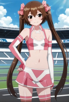 masterpiece, best quality, very aesthetic, absurdres, sensitive, scenery, 1girl, solo, looking at viewer, cowboy shot, long shot, symmetrical,shiny skin, tsukisato kirari(race queen cos),brown hair,very long hair,twintails with pink ribbon,brown eyes,bangs,hair between eyes,small breasts,pink shirts wth white center,collared shirts,sleeveless,white-trimmed neckline,white cross neck ornament,crop top,midriff,navel,pink skirt with white cross pattern,pink miniskirt with white trim,pink upper-arm band,vertically split color elbow gloves,half pink half white gloves,two-tone split down the middle elbow gloves,fingerless gloves,brown thighhighs with pink trim, gyrozetter race queen(costume), smile, blush, closed mouth, random poses, racing circuit, blue sky, sunny, <lora:月里光:0.7>, <lora:training_5701406-20260301123149785:0.9>