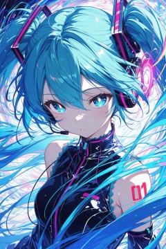 masterpiece, best quality, highly detailed,1girl, hatsune miku, upper body, white pupils, headphone, power elements, vibrant blue color palette, abstract,abstract background, dreamlike atmosphere, delicate linework, wind-swept hair,