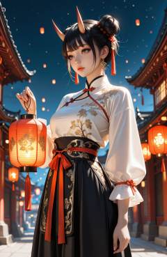masterpiece,best quality,very aesthetic,intricate detail,sharp focus,absurdres,high resolution,newest,realistic,photorealistic,1girl,solo,short hair,oni horns,black hair,hair bun,double bun,eyelashes,looking at lantern,holding lantern,shirt,skirt,long sleeves,ribbon,white shirt,black skirt,puffy short sleeves,golden Adornments,chinese embroidery,chinese clothes,jewelry,tassel,earrings,lantern,paper lantern,glowing,night sky,