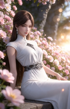 <lora:深空彼岸-赵清菡IL:0.7> 1girl, brown hair, long hair, brown eyes,earrings, jewelry, white dress,long dress,sleeveless, belt, lips,white footwear, high heels,, realistic style photo,outstanding style,Use soft lighting to cast gentle shadows on the subject,adding a touch of dimension to your images without compromising details,whirls of vapor,(Anime:1.1),soft neon light,ethereal ambiance,delicate details,magical atmosphere,concept art,highly detailed,ultra-high resolution,32K UHD,sharp focus,best-quality,masterpiece,golden hour,unconventional supreme masterpiece,masterful details,temperate atmosphere,with a high-end texture,in the style of fashion photography,magazine style,Dynamic Angle,Dynamic posture,magazine style,Dynamic Angle,Dynamic posture,(cowboy_shot:1.2),eye trail,depth of field,cinematic lighting,lens flare,close-up,extreme aesthetic,(wlop:0.6),(honjou raita,lack,rella,wanke:0.5),masterpiece,best quality,good quality,newest,year 2025,very aesthetic,absurdres,Visual impact,A shot with tension,ultra-high resolution,32K UHD,sharp focus,best-quality,masterpiece,Emotionalization,unconventional supreme masterpiece,masterful details,temperate atmosphere,with a high-end texture,in the style of fashion photography,(Visual impact:1.2),giving the poster a dynamic and visually striking appearance,, stairs,pink flower,blurry,sitting,full body,