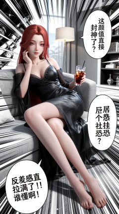 <lora:yushiqie-girl:1> 她叫雨师妾,一位红发紫眸的冷艳御姐,长发微卷,皮肤冷白,五官精致,眼神疏离。她穿着黑色真丝吊带睡裙,靠在落地窗边的沙发上,单手撑着脸颊,另一只手拿着一杯冰美式,双腿交叠,姿态慵懒又贵气。背景是现代轻奢公寓,落地窗、落地灯、书架,背景做黑白漫画风处理,人物主体为彩色。整体是漫画分镜风格,带有日式漫画的速度线、放射状特效线,画面中添加三个漫画对话气泡:右上角气泡内文字为「这颜值直接封神了吧?」,右下角气泡内文字为「居然是个社恐?」,左下角气泡内文字为「反差感直接拉满了!!谁懂啊!」,线条锐利分明,高对比度,8K 超高清,细节拉满,大师级画质,电影级光影,写实与二次元结合的画风。