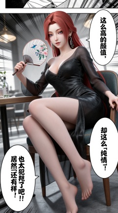 <lora:yushiqie-girl:0.9> 她叫雨师妾,一位红发蓝眼的绝美女性,长发披肩,发间别着蓝色发饰,皮肤白皙细腻,五官精致立体,眼神清冷。她穿着黑色修身连衣裙,袖子是半透明的薄纱材质,正优雅地坐在椅子上,双腿交叉,一只手拿着绘有花鸟图案的中式团扇,另一只手搭在腿上,姿态慵懒性感。背景是室内咖啡馆环境,有桌子、玻璃瓶、复古灯具,背景做黑白漫画风处理,人物主体为彩色。整体是漫画分镜风格,带有日式漫画的速度线、放射状特效线,画面中添加三个漫画对话气泡:右上角气泡内文字为「这么高的颜值,」,右下角气泡内文字为「却这么「纯情」!」,左下角气泡内文字为「也太犯规了吧!!居然还有这样的女生」,线条锐利分明,高对比度,8K 超高清,细节拉满,大师级画质,电影级光影,写实与二次元结合的画风。