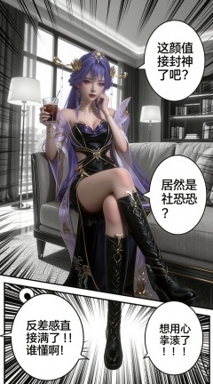 她叫天穹,一头飘逸的紫色长发,头上戴着金色华丽的蝴蝶翅膀。穿着一件精致、合身的黑色深V领连衣裙,上面有精致、闪闪发光的金色细节,穿着黑色长靴,靠在落地窗边的沙发上,单手撑着脸颊,另一只手拿着一杯冰美式,双腿交叠,姿态慵懒又贵气。背景是现代轻奢公寓,落地窗、落地灯、书架,背景做黑白漫画风处理,人物主体为彩色。整体是漫画分镜风格,带有日式漫画的速度线、放射状特效线,画面中添加三个漫画对话气泡:右上角气泡内文字为「这颜值直接封神了吧?」,右下角气泡内文字为「居然是个社恐?」,左下角气泡内文字为「反差感直接拉满了!!谁懂啊!」,线条锐利分明,高对比度,8K 超高清,细节拉满,大师级画质,电影级光影,写实与二次元结合的画风。 <lora:tianqiong_lora_v2:1> YY Anime style