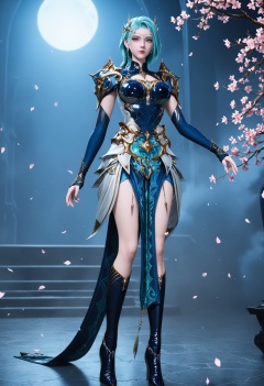 (standing full_body:1.1),(looking at viewer:1.1),masterpiece,(best quality),smog,Dark room,dim lighting,peach blossom,falling petals,<lora:YQ_Illustrious光辉v5_冰帝_V1:0.8>,q1528437228,1girl,solo,armor,shoulder armor,hair ornament,blue eyes,jewelry,pauldrons,earrings,blue hair,dress,long hair,short hair,gem,aqua hair,detached sleeves,blue dress,circlet,gloves,braid,boots,elbow gloves,blue nails,high heels,green hair,black footwear,knee boots,nail polish,high heel boots,pelvic curtain,blue gloves,blue footwear,medium hair,white dress,fingerless gloves,breastplate,