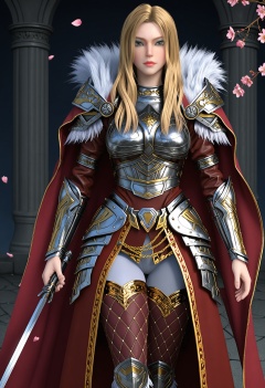 (cowboy shot:1.2),(looking at viewer:1.1),masterpiece,(best quality),smog,Dark room,dim lighting,peach blossom,falling petals,<lora:YQ_Illustrious光辉v5_凯莎_参数测试_V2:0.8>,q1528437228,1girl,solo,long hair,blonde hair,armor,cape,fur trim,shoulder armor,breastplate,pauldrons,red cape,boots,greaves,brown eyes,armored boots,grey eyes,gauntlets,thighhighs,eyeshadow,blue eyes,vambraces,high heels,boobplate,fur-trimmed cape,pantyhose,