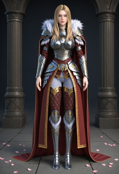 (standing full_body:1.1),(looking at viewer:1.1),masterpiece,(best quality),smog,Dark room,dim lighting,peach blossom,falling petals,<lora:YQ_Illustrious光辉v5_凯莎_参数测试_V2:0.8>,q1528437228,1girl,solo,long hair,blonde hair,armor,cape,fur trim,shoulder armor,breastplate,pauldrons,red cape,boots,greaves,brown eyes,armored boots,grey eyes,gauntlets,thighhighs,eyeshadow,blue eyes,vambraces,high heels,boobplate,fur-trimmed cape,pantyhose,