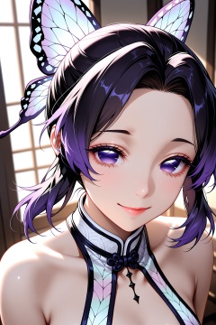 masterpiece,very awa,best quality,amazing quality,very aesthetic,absurdres,newest,intricate details,skindentation,realistic,1girl,solo,eyelashes,smile,looking at viewer,portrait, smile,floating hair,small breasts,(butterfly hair ornament,gradient hair,multicolored hair,purple eyes,purple hair,two-tone hair,kochou shinobu),
