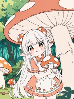 PTXT, 二次元平涂线条风,软萌圆润的线条,浅粉平涂,奶白发的软萌精灵从巨型蘑菇的菌盖后探出头,圆脸蛋带着甜甜的笑意,头戴蘑菇斑点的小巧发饰,身着奶白与橘粉拼接的精灵短衫,裙摆绣着蘑菇纹样,小手抱着蘑菇菌柄,背景是鲜绿与暖橙的奇幻森林,软萌治愈二次元风格,精灵好奇窥探森林秘境