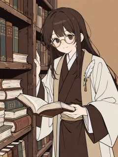 PTXT, 二次元平涂线条风,沉稳厚重的线条,深棕平涂,深棕发的儒雅学者从旧书阁楼的书架后探身,眉眼温和知性,戴着金丝边圆框眼镜,身着深棕与米白拼接的复古学者袍,领口别着羽毛笔饰,一手扶着堆满古籍的书架,背景是暖棕做旧的复古书阁,文艺知性二次元风格,学者悄然翻阅古籍