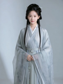 DJYS, 短剧影视人像质感,青丝挽髻的古装少女立于纯浅灰极简影棚中央,目光温婉沉静,身着交领素色襦裙,外搭薄纱云纹披风,腰间系素银玉佩,正面柔光均匀铺展,弱化阴影凸显衣物质感与面部轮廓,背景干净无杂,整体氛围清雅温婉,人物主体视觉焦点突出