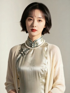 DJYS, 短剧影视人像质感,短发利落的民国千金静立于米白纯色背景前,眼神灵动矜贵,身穿收腰缎面旗袍,领口缀珍珠盘扣,外搭薄款针织开衫,柔和侧光勾勒肩颈线条,背景极简留白,尽显复古雅致的人物气质